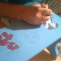 I za kraj nemam puno šta da dodam, sem tog da kada uradimo crtež crnom bojom i krenemo da radimo likove, je da ako podloga nije bela ili svetla, u ovom slučaju plava je da zamućene boje nisu onakve kakve smo zamutili, menjaju nijansu zbog tamnije podloge, i tu je potrebno određenog iskustva. Ali moj savet je da boje budu malo gušće iako je fora da se na drvetu radi sa više lazurnih slojeva, boju mitimo do neke granice da nije pregusta da ne ostaju puno tragovi od četkice, već po osećaju naći granicu gustine, iliti praviti malo tamnije boje koje će na tamnijoj podlozi biti bliže originalno zamišljenoj.U svakom slučaju dovoljno slojeva 5-6 doneće željeni rezultat